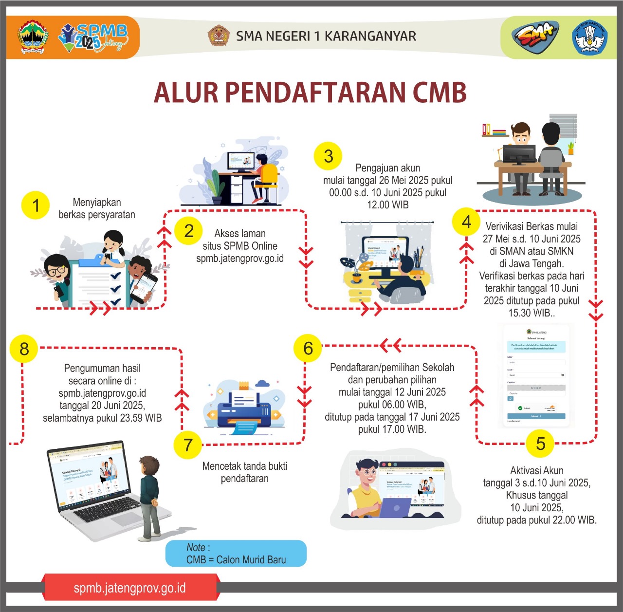 Bagi CMB yang hadir ke SMA N 1 Karanganyar, harap datang pukul 08.00 WIB karena masih terdapat kegiatan upacara bendera, mengingat proses pembelajaran reguler masih berlangsung.